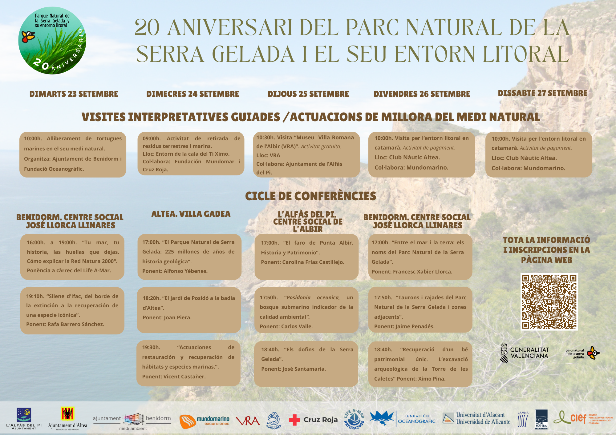 Del 23 al 27 de septiembre l’Alfàs del Pi, Altea y Benidorm celebran conjuntamente el 20º aniversario del Parque Natural de la Serra Gelada, con un ciclo de conferencias y visitas guiadas, relacionadas con este enclave de alto valor ecológico y paisajístico. El primer parque marítimo-terrestre de la Comunitat Valenciana, con una gran parte de su superficie en el medio marino.