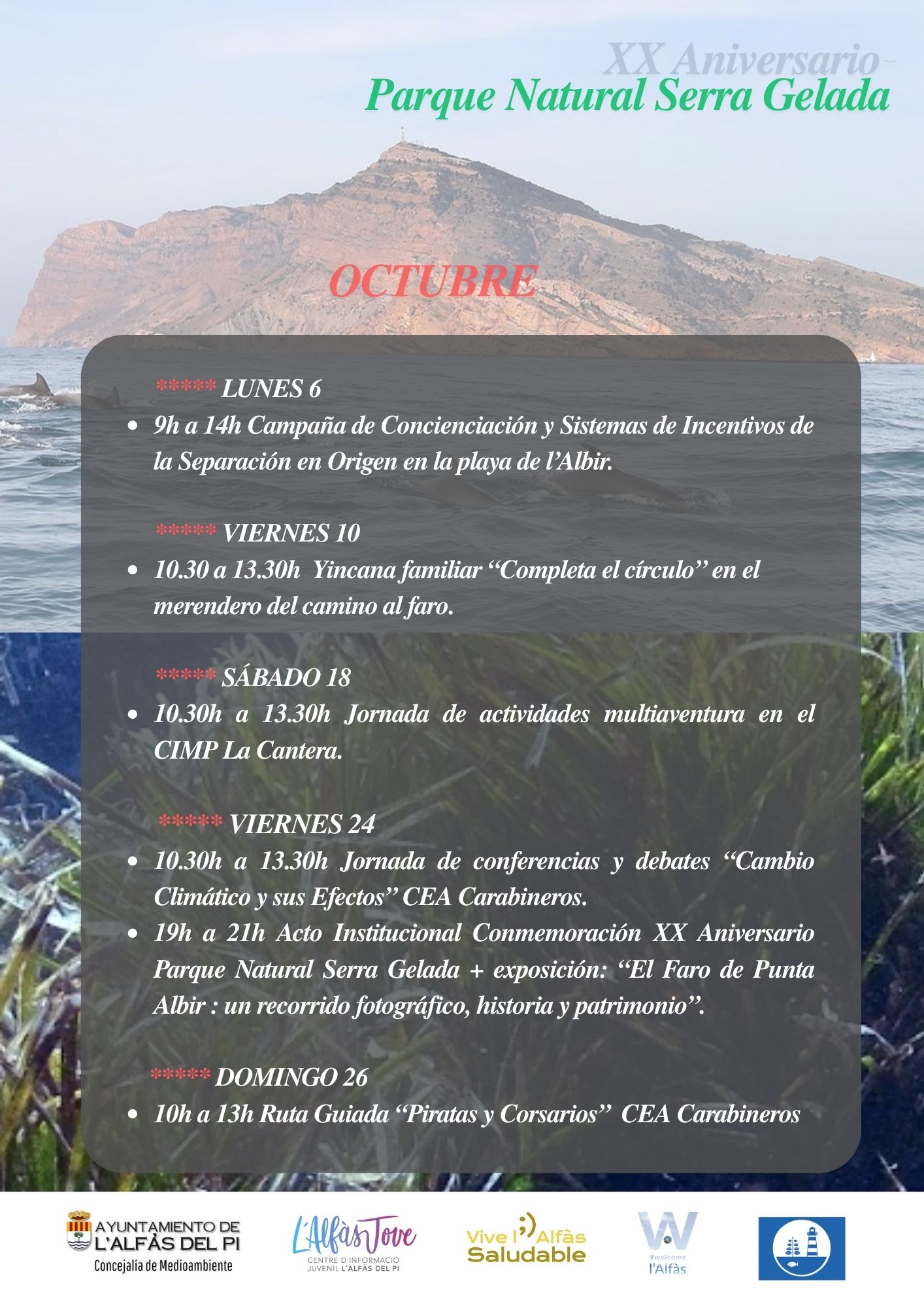 Dentro de la campaña ‘Vive l’Alfàs Saludable’ y celebrando el XX aniversario del Parque Natural de Serra Gelada, el Ayuntamiento de l’Alfàs del Pi ha organizado una serie de actividades al aire libre: una yincana en el sendero azul al faro de l’Albir el día 10; una jornada multiaventura en el CIMP la Cantera el 18; y una ruta guiada de piratas y corsarios el 26 de octubre. Y el plato fuerte será el día 24 en el CEA Carabineros, una jornada de mañana y tarde para hablar del Cambio Climático y sus Efectos. El alcalde de l’Alfàs del Pi, Vicente arques, junto al concejal de Turismo y Medio Ambiente, Luis Morant, ha presentado las actividades “dirigidas a todos los públicos”.