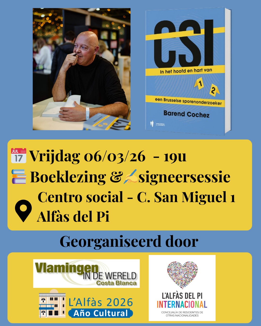El próximo viernes 6 de marzo, a las 19:00 horas, el Centro Social Platja Albir de l’Alfàs del Pi acogerá una conferencia en neerlandés a cargo de Barend Cochez, ex investigador de la Policía Judicial Federal de Bélgica y autor del libro ‘CSI – In het hart en het hoofd van een Brusselse sporenonderzoeker’.