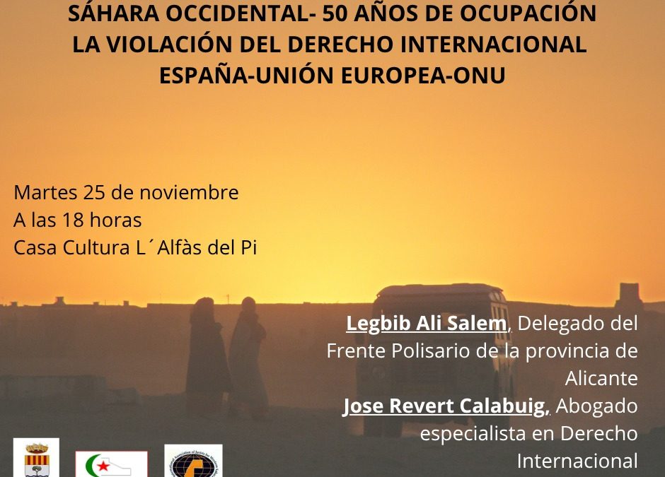 El próximo martes 25 de noviembre, la Casa de Cultura de l’Alfàs del Pi acogerá, a las 18:00 horas, una charla sobre la situación del Sáhara Occidental tras cinco décadas de ocupación, la vulneración del derecho internacional y el papel desempeñado por España, la Unión Europea y las Naciones Unidas.