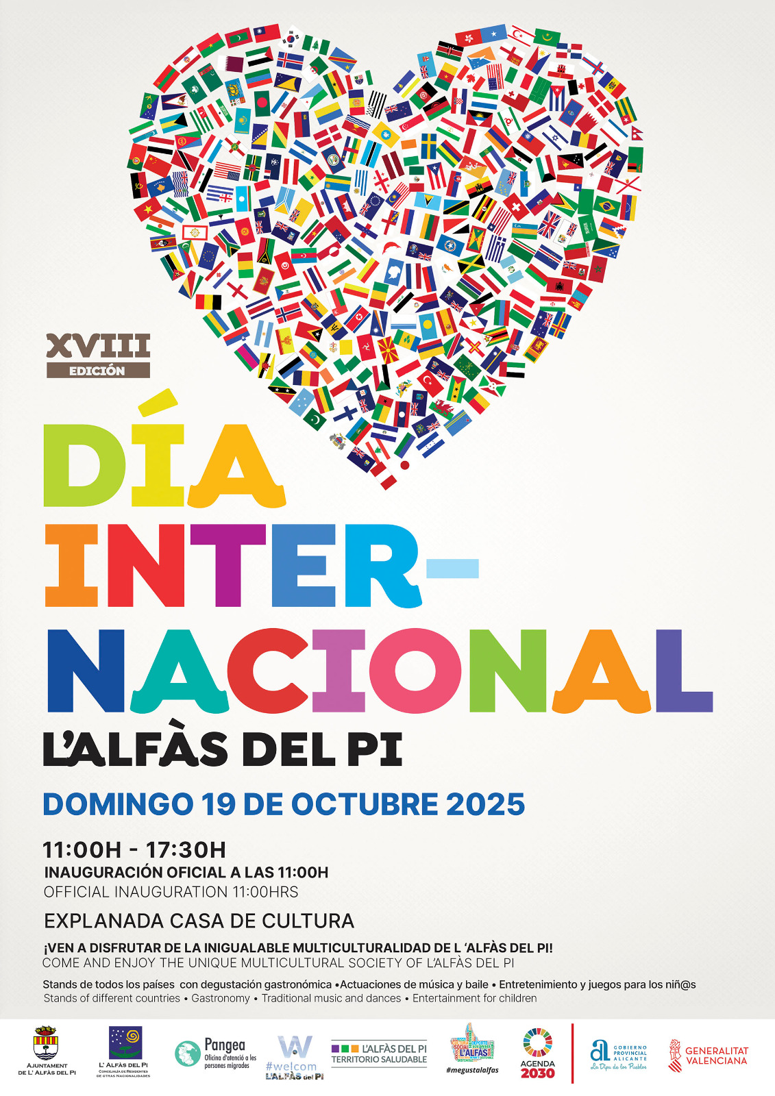 El Día Internacional de l’Alfàs del Pi es una de las iniciativas pioneras en la Marina Baixa, que pone en valor la convivencia de personas de casi un centenar de nacionalidades diferentes, y se ha convertido en un referente de la integración y la diversidad en la comarca. Desde la primera edición, las asociaciones y colectivos de residentes internacionales han sido piezas clave en la organización del evento, compartiendo sus tradiciones y enriqueciendo el municipio con su multiculturalidad. En caso de querer participar, las asociaciones de residentes extranjeros del municipio deben ponerse en contacto con el área de Residentes Internacionales del Ayuntamiento de l’Alfàs del Pi.