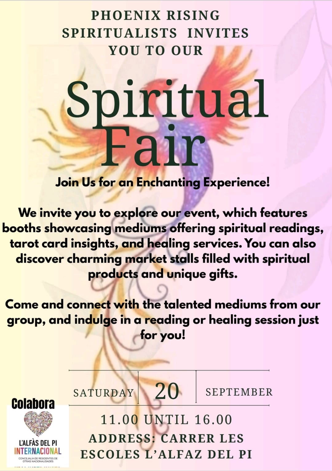 La asociación Phoenix Rusing Spiritualists, implantada en l’Alfàs, está integrada por médiums, clarividentes, sanadores y trabajadores espirituales internacionales, de reconocido prestigio en su campo. El sábado 20 se habilitarán diferentes puestos en les Escoles Velles y el público asistente tendrá la oportunidad de conocer al equipo dedicado a trabajar la espiritualidad, a través de sesiones prácticas de lectura, sanación y asesoramiento espiritual, según ha explicado Kenny Corris, de Phoenix Rising