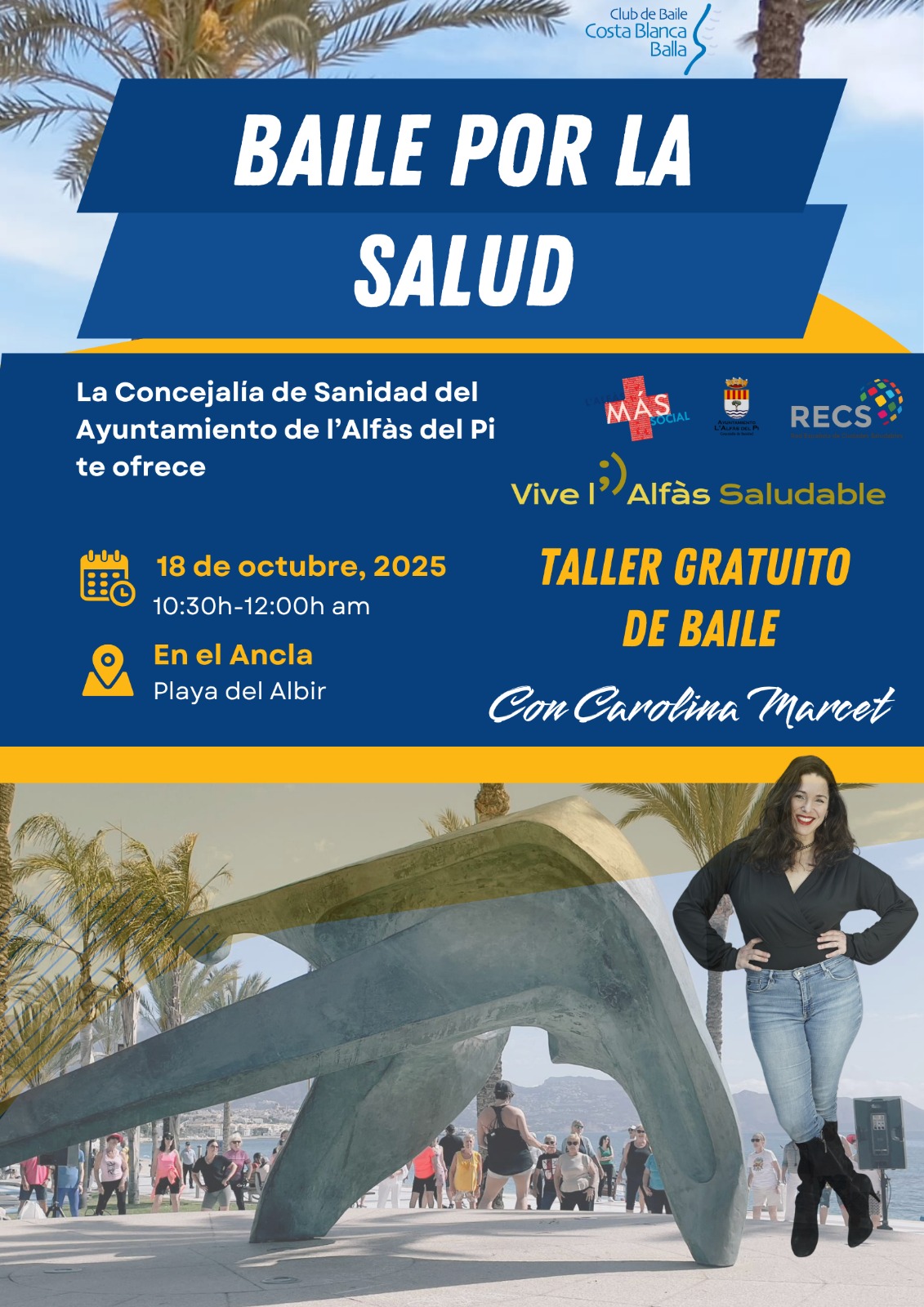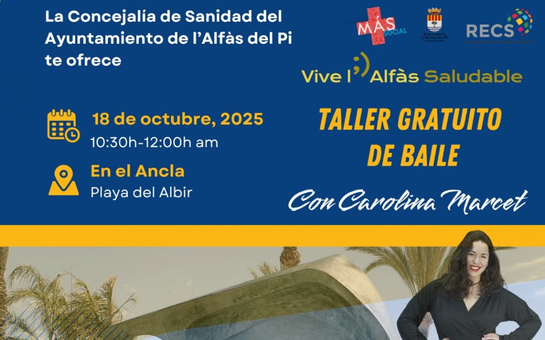 Este sábado 19 de octubre, de 10:30 a 12:00 horas, vuelve a la playa de l’Albir el taller gratuito ‘Baila por la Salud’, una iniciativa de la concejalía de Sanidad del Ayuntamiento de l’Alfàs del Pi en colaboración con el Club Costa Blanca Balla y la instructora de baile Carolina Marcet. La actividad se celebrará junto a la escultura del ancla de Jorge Castro, en el Paseo de las Estrellas, un entorno privilegiado frente al mar.