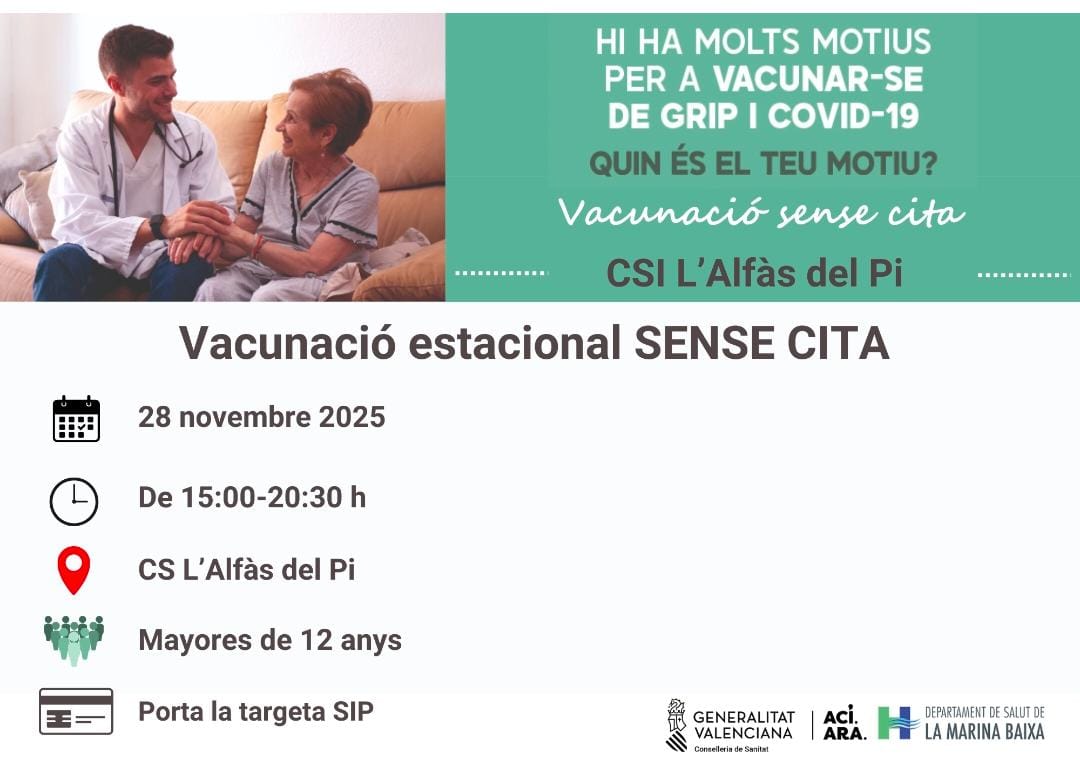 La concejalía de Sanidad del Ayuntamiento de l’Alfàs del Pi informa de la jornada de vacunación para mayores de 12 años de gripe y COVID, sin cita previa, que va a celebrase mañana viernes, 28 de noviembre, en el Centro de Salud, desde las 15:00 horas hasta las 20:30 horas, con el fin de proteger a la población frente a estos virus respiratorios de cara al invierno. Importante llevar la tarjeta SIP.