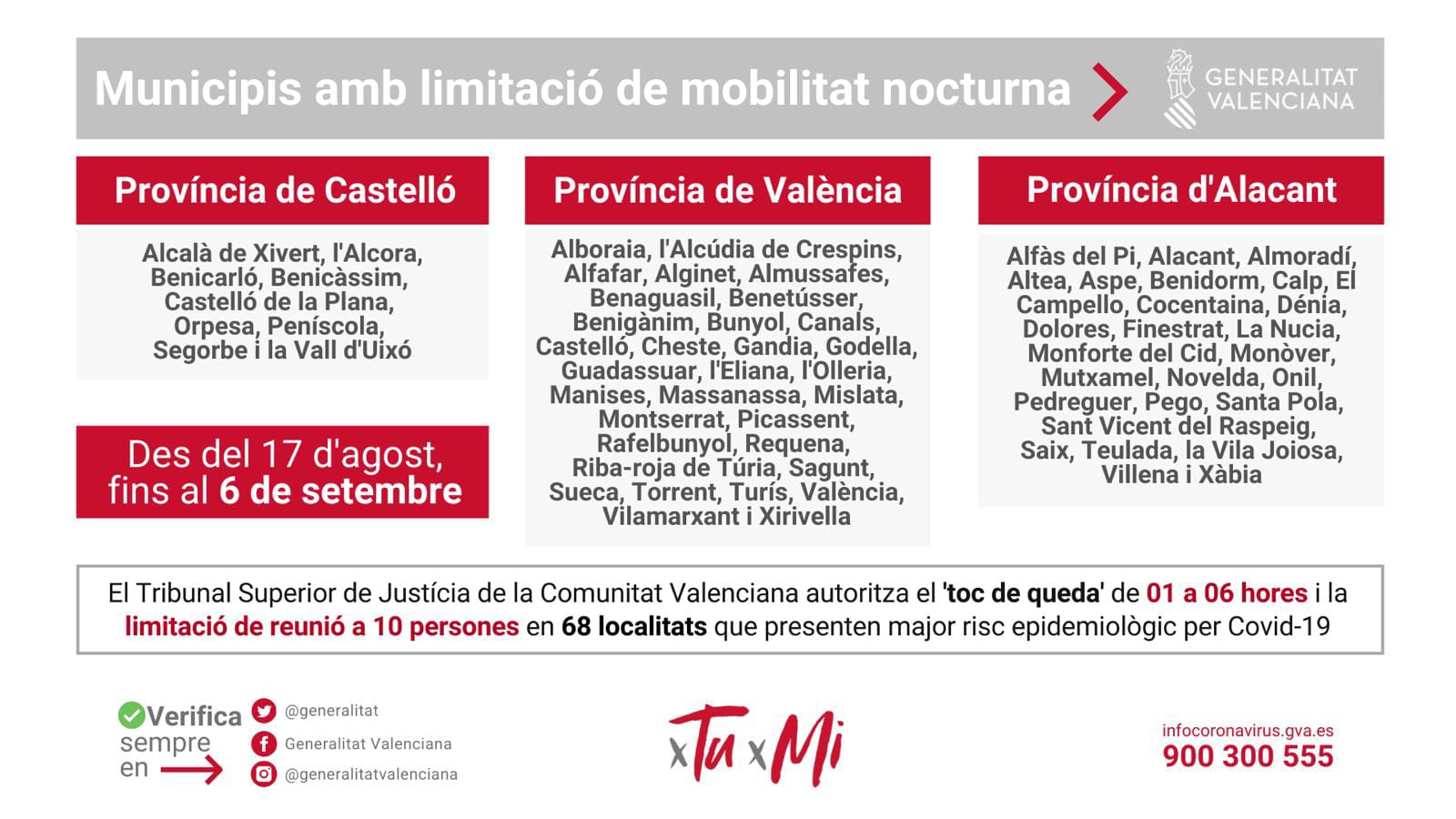 En la provincia de Valencia, las localidades con toque de queda y limitación en reuniones sociales son 32: Alboraya, l’Alcúdia de Crespins, Alfafar, Alginet, Almussafes, Benaguasil, Benetússer, Benigànim, Buñol, Canals, Cheste, Xirivella, l’Eliana, Gandia, Godella, Guadassuar, Manises, Massanassa, Mislata, Montserrat, l’Olleria, Picassent, Rafelbunyol, Requena, Riba-roja de Túria, Sagunto, Sueca, Torrent, Turís, València, Vilamarxant y Villanueva de Castellón.