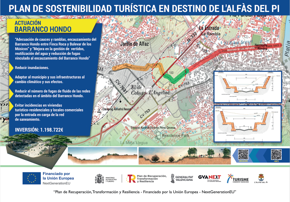 El Barranco Hondo inicia su recorrido en la vecina localidad de La Nucía, atravesando suelos urbanos de dicha población, y penetrando en l’Alfàs donde recoge las aguas de escorrentía de suelos urbanos y no urbanos, hasta su desembocadura en la playa de l’Albir, el tramo más cercano al mar y más sensible a las inundaciones, considerada por tanto una actuación urgente. Hablamos de un ámbito de actuación de gran afección turística, donde se concentra el mayor número de establecimientos de restauración, hostería, ocio y vivienda del término municipal. “Con estas mejoras se prevé reducir las situaciones de inundación que afectan a importantes áreas turísticas, a la vez que se posibilita una mayor resiliencia del destino en atención a los efectos del cambio climático, concretamente a los producidos por fenómenos extremos como son las lluvias torrenciales”,