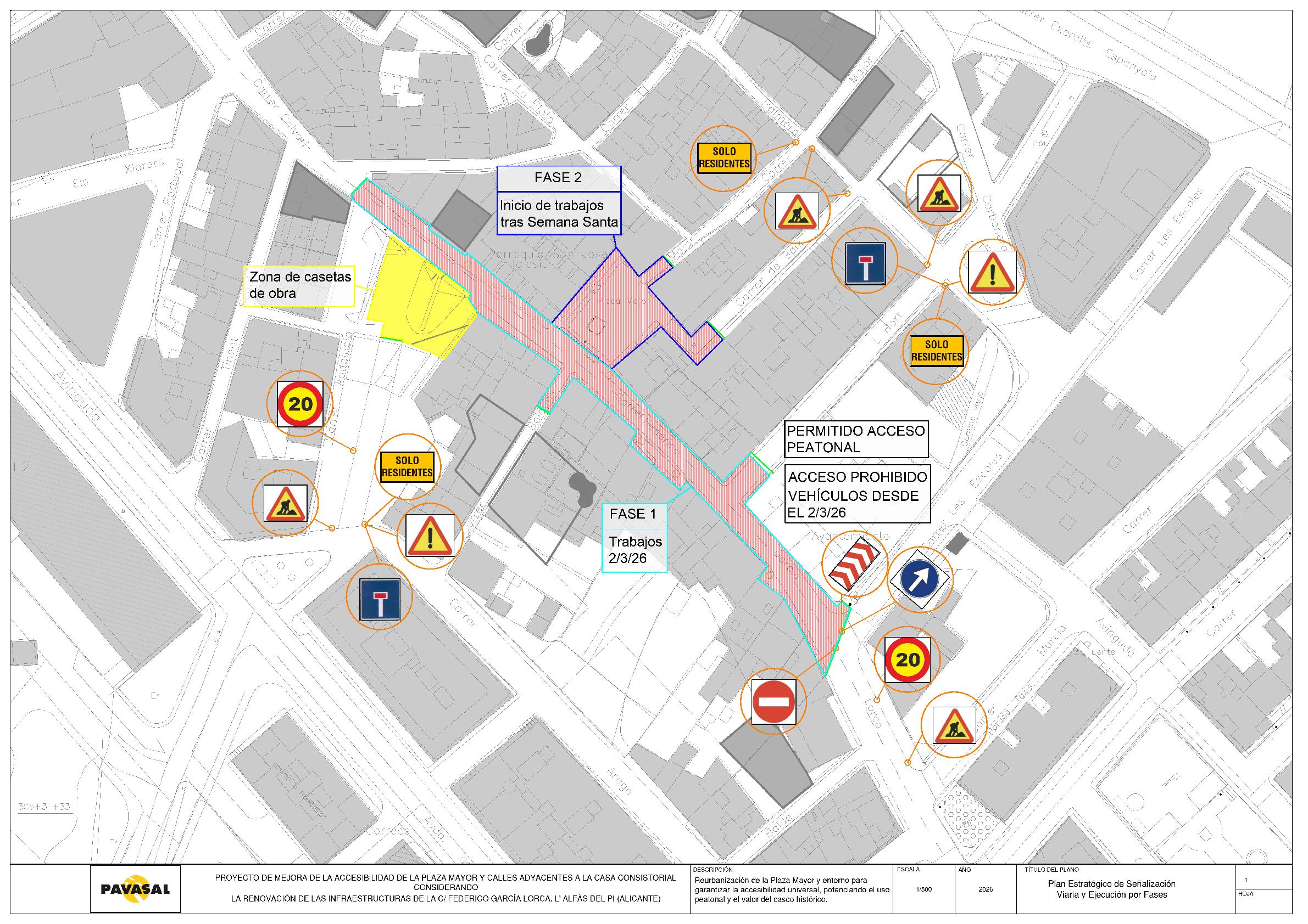 El proyecto afecta a la plaza Mayor, donde se ubica la Parroquia de San José, y al tramo de la calle Federico García Lorca comprendido entre la calle Escuelas y la plaza Jaume I. Durante la ejecución de las obras se procederá al corte al tráfico en esta vía. Los trabajos se ejecutarán por fases, comenzando por la calle Federico García Lorca. La segunda fase, que comenzará tras la Semana Santa, se centrará en la plaza Mayor.
